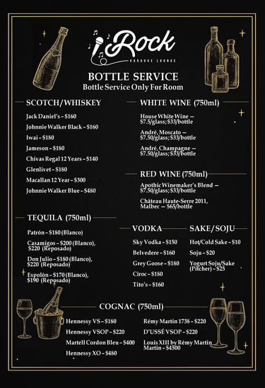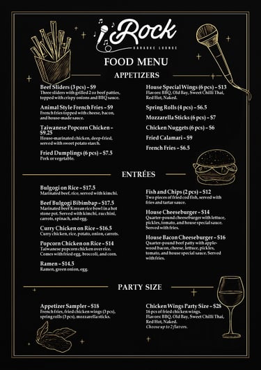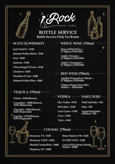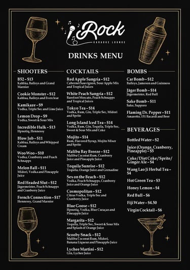 Elevate your karaoke experience with delicious food and drinks at iRock. Enjoy at bar, or keep the party going by ordering directly to your karaoke box. For groups, we offer sharing plates perfect for larger gatherings, special occasions, and work parties. Drinks-wise, we’ve got wine, Champagne, cocktails, soft drinks, shots and punch bowls to pair with your meal. Sing, eat, and celebrate with us!